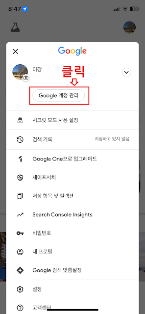 3. 프로필로 들어가서 "Google 계정 관리"를 클릭해 줍니다.