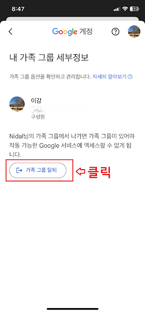 7. "가족 그룹 탈퇴" 버튼을 눌러줍니다.